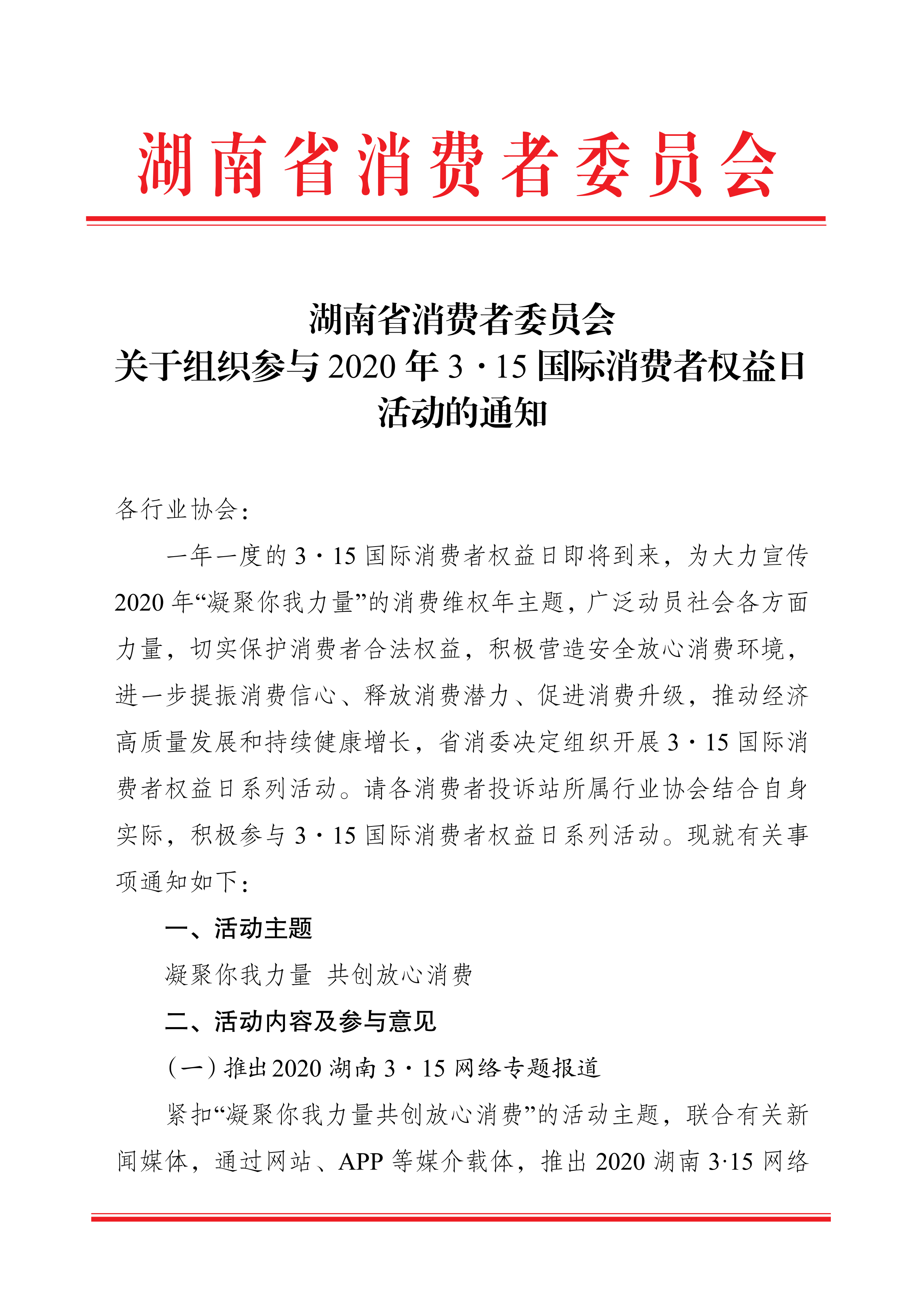 湖南省消費者委員會關于組織參與 2020 年 3·15 國際消費者權(quán)益日