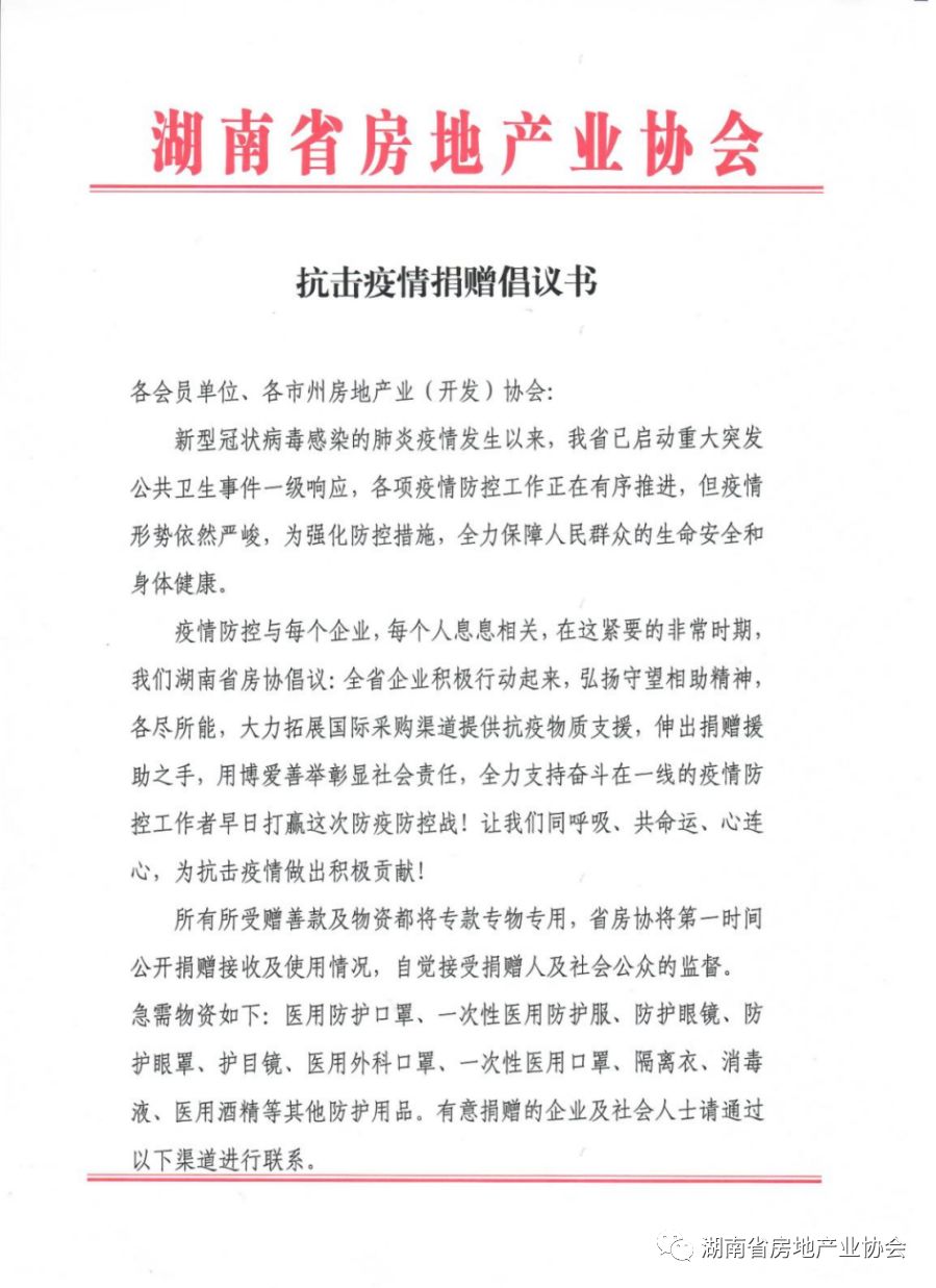 一方有難,八方支援,抗擊疫情,共克時(shí)艱!倡議發(fā)出后,各開發(fā)會(huì)員單位積極響應(yīng),奉獻(xiàn)愛心!截止至2月21日,全省共17家省房協(xié)開發(fā)會(huì)員單位加入愛心捐贈(zèng)隊(duì)伍,其中大漢城鎮(zhèn)建設(shè)有限公司捐贈(zèng)口罩20000個(gè);湖南保利房地產(chǎn)開發(fā)有限公司捐贈(zèng)2500ml的酒精100瓶、20KG消毒液的80桶;湖南省中欣房地產(chǎn)開發(fā)集團(tuán)有限公司捐贈(zèng)護(hù)目鏡200副、酒精50桶、方便面20箱、口罩1000個(gè);長(zhǎng)沙雙瑞房地產(chǎn)開發(fā)有限公司捐贈(zèng)價(jià)值20000元口罩;長(zhǎng)沙方略投資發(fā)展有限公司捐贈(zèng)價(jià)值10000元口罩等等(詳見附件)……