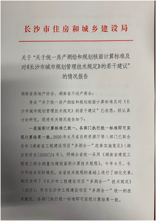 同時(shí),長(zhǎng)沙市住房和城鄉(xiāng)建設(shè)局給予了官方書面意見回復(fù)。對(duì)建議所提及的面積計(jì)算統(tǒng)一標(biāo)準(zhǔn),市建設(shè)局表示為深入貫徹落實(shí)黨中央、國(guó)務(wù)院和省委、省政府關(guān)于深化“放管服”改革和優(yōu)化營(yíng)商環(huán)境的部署要求,今年6月湖南省自然資源廳等8部委聯(lián)合發(fā)布了《關(guān)于湖南省工程建設(shè)項(xiàng)目“多測(cè)合一”改革的意見》,目前實(shí)施細(xì)則正在討論編制中,預(yù)計(jì)近期將推出,可完善解決協(xié)會(huì)提出的大部分問(wèn)題。