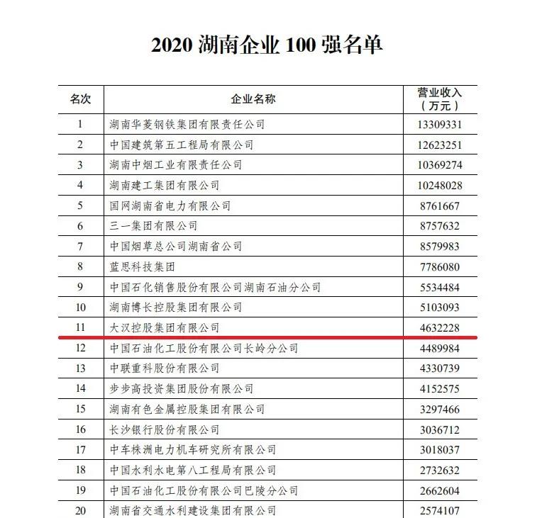 最新消息,11月5日上午,2020年湖南企業(yè)家活動日暨企業(yè)家年會上發(fā)布了湖南企業(yè)100強名單,省房協(xié)會長單位大漢控股集團有限公司榮列2020湖南企業(yè)100強第11位,湖南服務(wù)業(yè)企業(yè)50強第3位。
