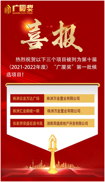 3月31日,由中國房地產(chǎn)業(yè)協(xié)會、住房和城鄉(xiāng)建設部住宅產(chǎn)業(yè)化促進中心共同組織的第十屆(2021-2022年度) “廣廈獎”第一批候選項目名單重磅出爐!經(jīng)湖南省房地產(chǎn)業(yè)協(xié)會推薦的三個項目榮獲殊榮!