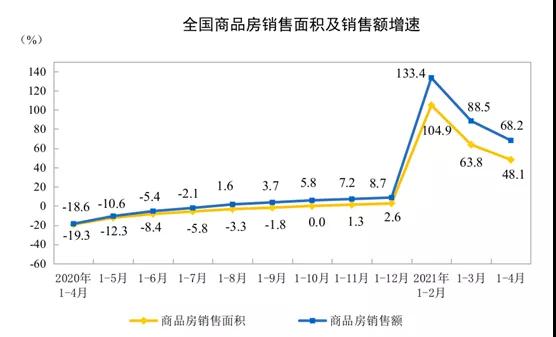 1—4月份,商品房銷售面積50305萬平方米,同比增長(zhǎng)48.1%;比2019年1—4月份增長(zhǎng)19.5%,兩年平均增長(zhǎng)9.3%。其中,住宅銷售面積增長(zhǎng)51.1%,辦公樓銷售面積增長(zhǎng)20.0%,商業(yè)營(yíng)業(yè)用房銷售面積增長(zhǎng)16.3%。商品房銷售額53609億元,增長(zhǎng)68.2%;比2019年1—4月份增長(zhǎng)37.0%,兩年平均增長(zhǎng)17.0%。其中,住宅銷售額增長(zhǎng)73.2%,辦公樓銷售額增長(zhǎng)31.9%,商業(yè)營(yíng)業(yè)用房銷售額增長(zhǎng)20.3%。