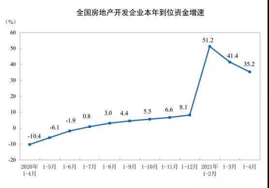 1—4月份,房地產(chǎn)開發(fā)企業(yè)到位資金63542億元,同比增長(zhǎng)35.2%;比2019年1—4月份增長(zhǎng)21.1%,兩年平均增長(zhǎng)10.1%。其中,國(guó)內(nèi)貸款9043億元,增長(zhǎng)3.6%;利用外資17億元,下降28.3%;自籌資金17167億元,增長(zhǎng)15.4%;定金及預(yù)收款24362億元,增長(zhǎng)74.1%;個(gè)人按揭貸款10738億元,增長(zhǎng)41.3%。