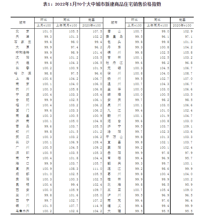 2022年1月份70個大中城市商品住宅銷售價格變動情況