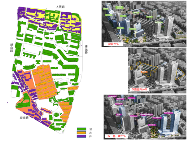 圖1 湖橡更新片區(qū)留、改、拆范圍圖及效果圖