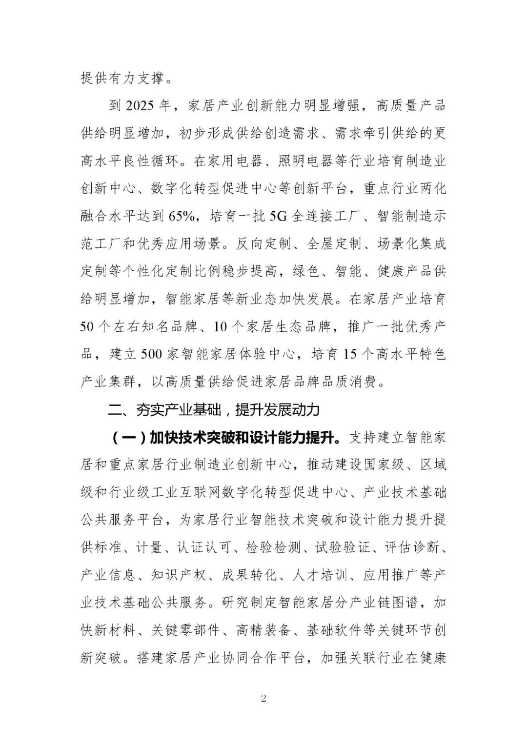 《方案》明確發(fā)展目標(biāo),到2025年,在家用電器、照明電器等行業(yè)培育制造業(yè)創(chuàng)新中心、數(shù)字化轉(zhuǎn)型促進(jìn)中心等創(chuàng)新平臺(tái),重點(diǎn)行業(yè)兩化融合水平達(dá)到65%,培育一批5G全連接工廠、智能制造示范工廠和優(yōu)秀應(yīng)用場(chǎng)景。反向定制、全屋定制、場(chǎng)景化集成定制等個(gè)性化定制比例穩(wěn)步提高,綠色、智能、健康產(chǎn)品供給明顯增加,智能家居等新業(yè)態(tài)加快發(fā)展。