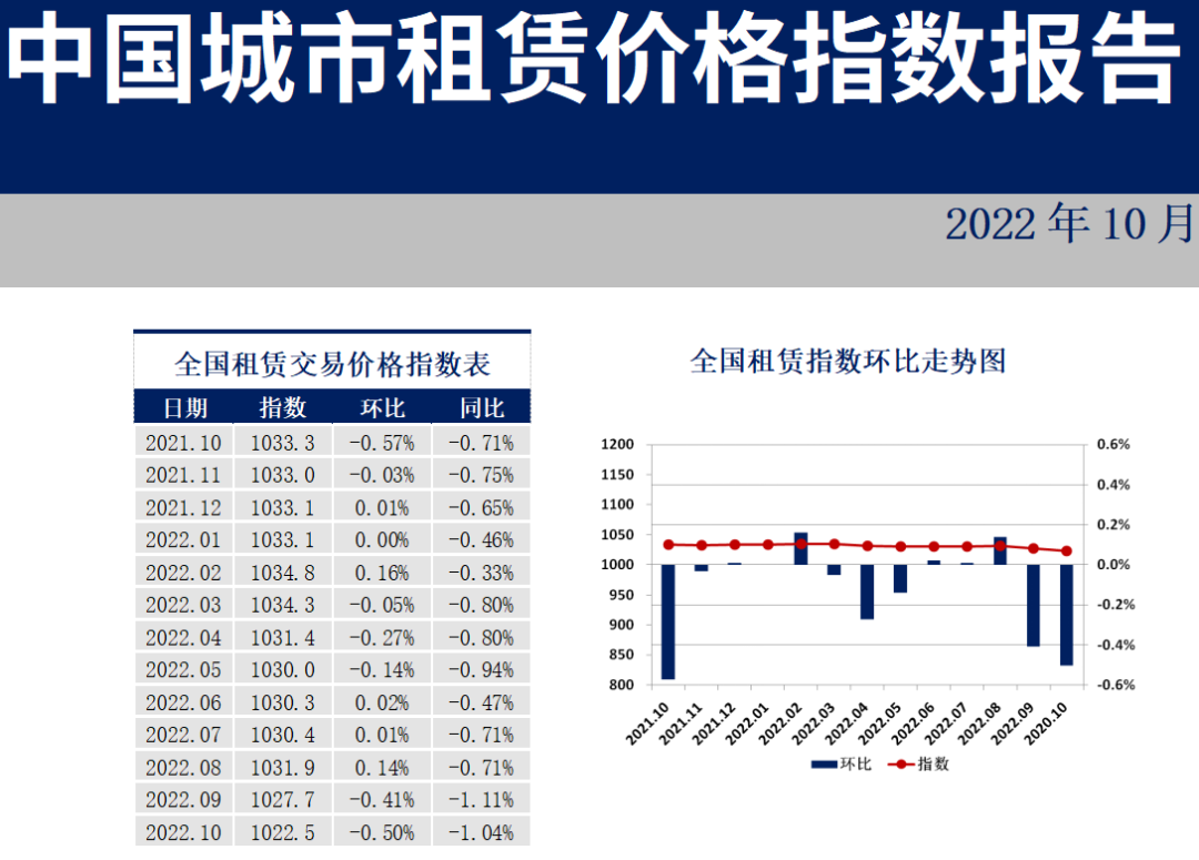 近日,由易居企業(yè)集團(tuán)、上海易居房地產(chǎn)研究院、華東師范大學(xué)東方房地產(chǎn)研究院三方共同發(fā)布的《中國城市住房租賃價格指數(shù)報告》顯示,2022年10月,中國城市租賃價格指數(shù)為1022.5點(diǎn),較上月下降5.2點(diǎn),環(huán)比下跌0.50%,同比跌幅1.04%。