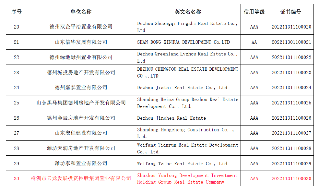 近日,中國(guó)房地產(chǎn)業(yè)協(xié)會(huì)公布2022年房地產(chǎn)開發(fā)企業(yè)信用等級(jí)結(jié)果。2022年全國(guó)房地產(chǎn)開發(fā)企業(yè)獲得信用等級(jí)共有43家。在湖南省房地產(chǎn)業(yè)協(xié)會(huì)的組織和推薦下,株洲市云龍發(fā)展投資控股集團(tuán)置業(yè)有限公司獲得信用評(píng)價(jià)AAA等級(jí)。