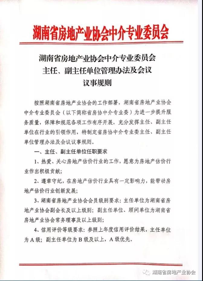 湖南省房地產(chǎn)業(yè)協(xié)會中介專業(yè)委員會主任、副主任單位管理辦法及會議議事規(guī)則