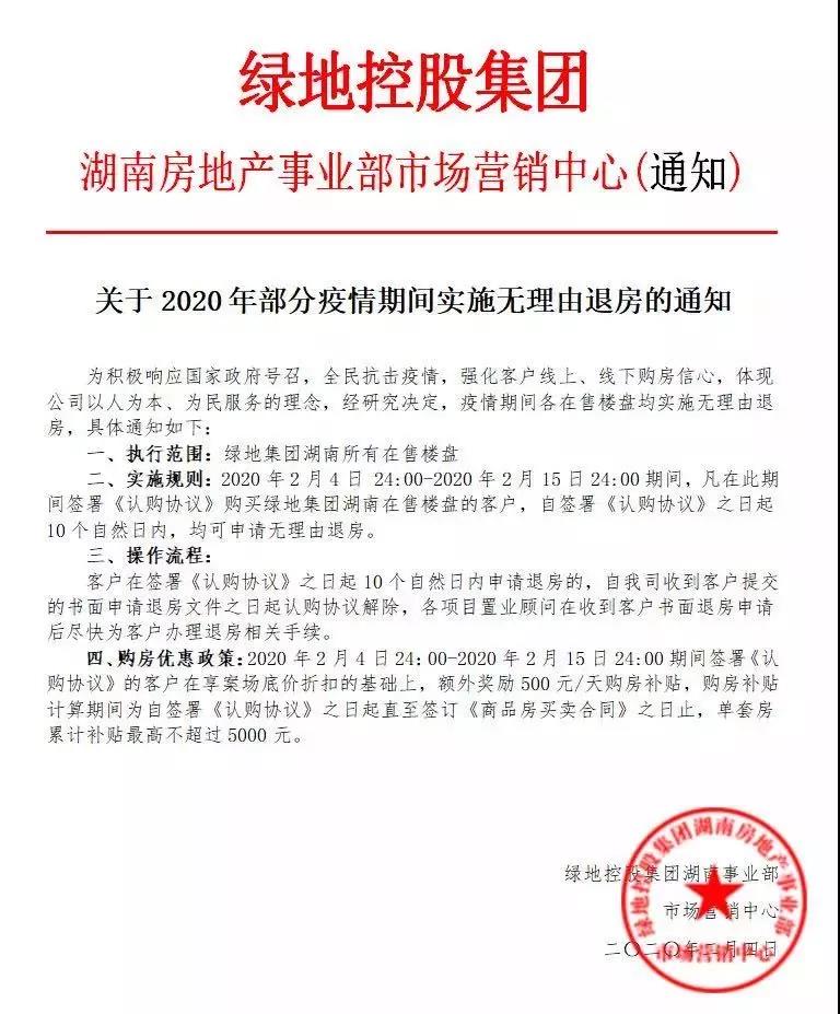 據(jù)路邊社消息,湖南綠地近日推出“無理由退房,每日500元補貼”政策,共同抗“疫”!