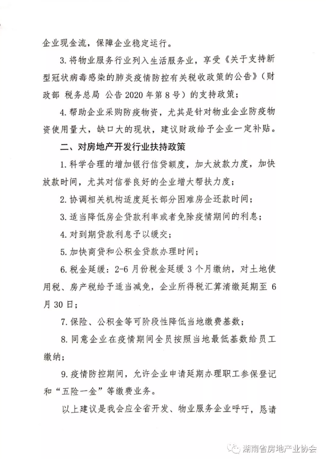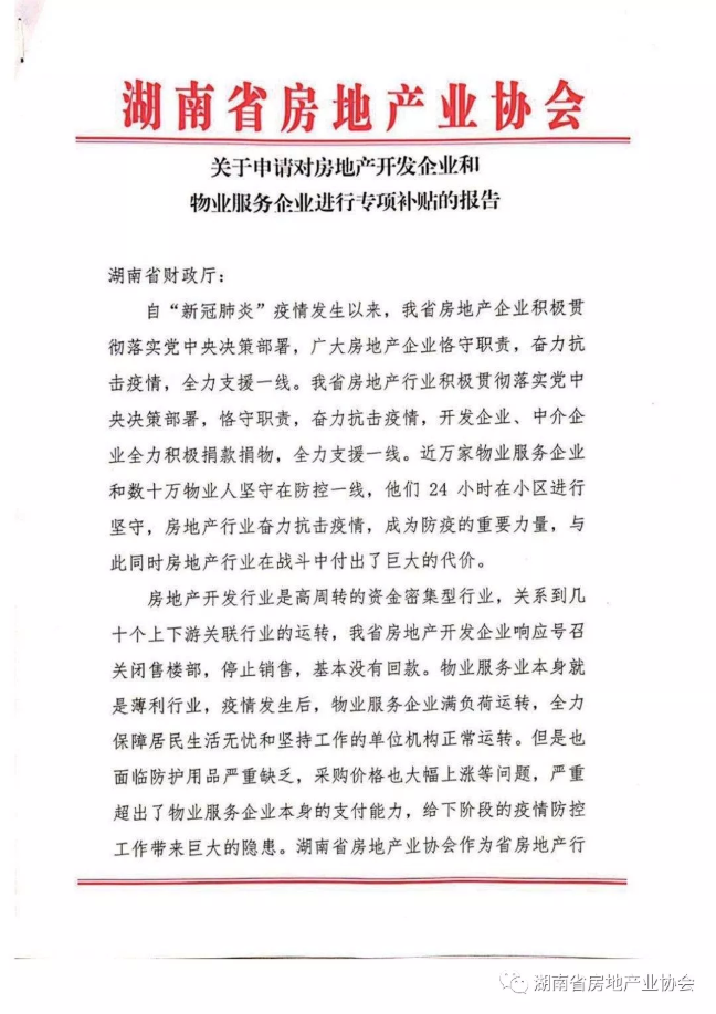 2月17日我會針對開發(fā)、物業(yè)、中介行業(yè)普遍存在的困難,向湖南省財政廳、湖南省稅務局分別提交了《關于申請對房地產(chǎn)開發(fā)企業(yè)和物業(yè)服務企業(yè)進行專項補貼的報告》(以下簡稱“報告”),為行業(yè)爭取扶持政策,渡過難關。省住建廳領導非常重視,廳長及分管副廳長親自指導過問“報告”起草工作,省廳房產(chǎn)處與省財政、省稅務局、省發(fā)改委相關處室、部門多次對接,介紹行業(yè)存在的困難,介紹其他省份已經(jīng)出臺的幫扶政策,積極爭取政策幫助。