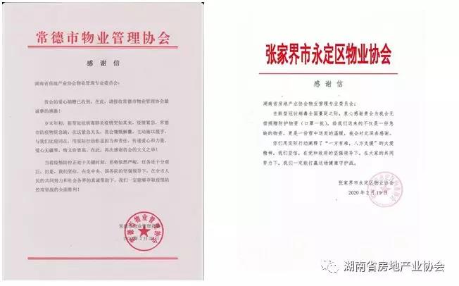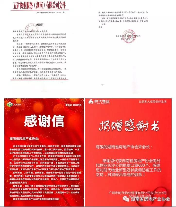 “您好!這里是湖南省房地產(chǎn)業(yè)協(xié)會(huì)物業(yè)管理專業(yè)委員會(huì),現(xiàn)在防疫物資緊張,我們籌集了一些防疫物資,免費(fèi)贈(zèng)送給會(huì)員單位……”這幾天,湖南省房協(xié)物專委會(huì)員單位都會(huì)接到電話。自疫情發(fā)生以來(lái),為有效控制疫情的輸入、傳播和蔓延,湖南省房地產(chǎn)業(yè)協(xié)會(huì)物業(yè)管理專業(yè)委員會(huì)始終踐行著行業(yè)的使命和擔(dān)當(dāng),為廣大會(huì)員謀福祉,為廣大業(yè)主的安康謀心安。為幫物業(yè)企業(yè)解燃眉之急,切實(shí)發(fā)揮行業(yè)組織作用,湖南省房協(xié)向全社會(huì)發(fā)出倡議,募集了一批防疫物資,向所有會(huì)員單位進(jìn)行捐贈(zèng),同時(shí)組織對(duì)各市州物業(yè)管理協(xié)會(huì)、每個(gè)會(huì)員單位和非會(huì)員單位(向我會(huì)反饋防疫物資極度匱乏的物業(yè)企業(yè))進(jìn)行了定向捐贈(zèng),得到了他們一致感謝和點(diǎn)贊,許多會(huì)員單位都紛紛發(fā)送感謝信表達(dá)誠(chéng)摯的謝意。