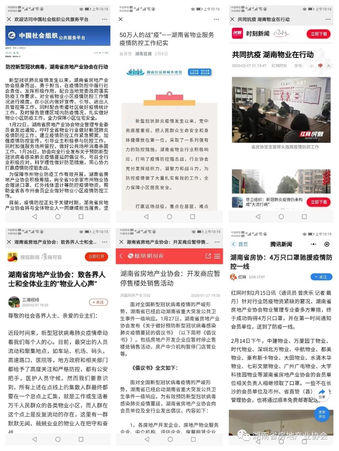 5.組織省內外媒體為行業(yè)抗疫宣傳鼓勁。我會聯(lián)系民政部國家社會組織管理局官網中國社會組織公共服務平臺、中國建設報、中國物業(yè)管理協(xié)會官網和公眾號、省住建廳官網和公眾號新華網、搜狐網、湖南日報、新湖南、紅網、新浪樂居、瀟湘晨報等10多家國家、省級媒體宣傳報道行業(yè)抗疫新聞,積極有力的引導全行業(yè)的防控工作。協(xié)會開設全省防疫工作專題網頁,聯(lián)系省內外新聞媒體做好行業(yè)疫情宣傳。
