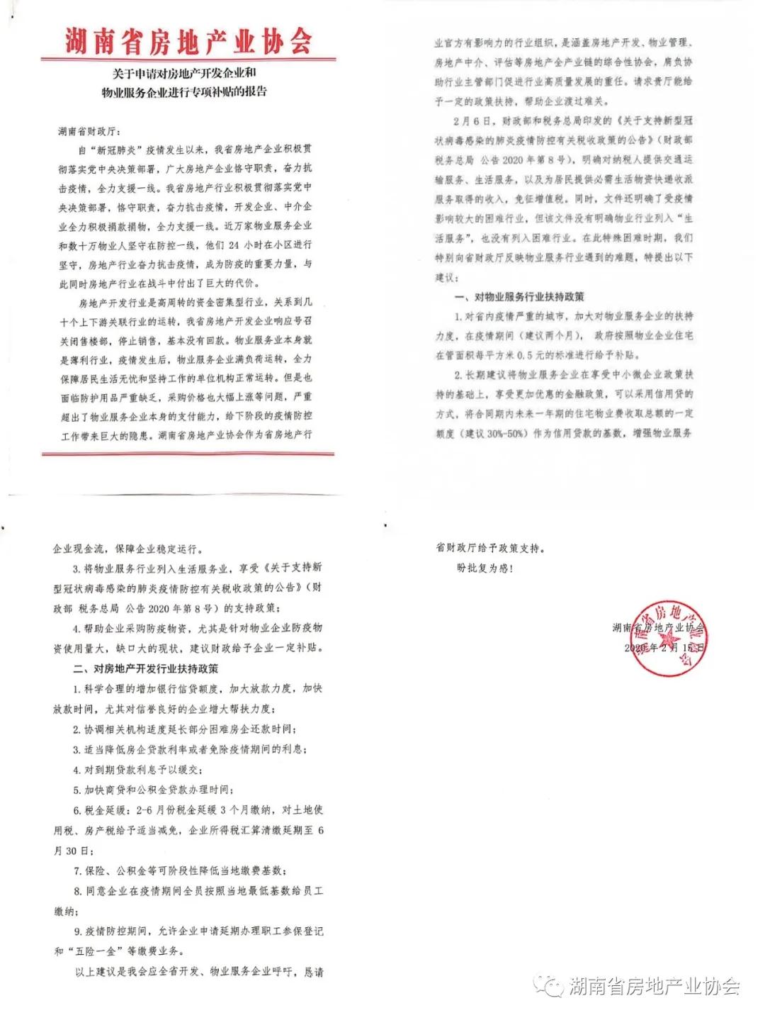 疫情過后行業(yè)如何迅速恢復生產,健康發(fā)展是省房協(xié)關切的重點。針對開發(fā)、物業(yè)、中介、評估行業(yè)普遍存在的困難,我會向湖南省財政廳、湖南省稅務局分別提交了《關于申請對房地產開發(fā)企業(yè)和物業(yè)服務企業(yè)進行專項補貼的報告》,為行業(yè)爭取扶持政策,幫助企業(yè)渡過難關。省住建廳領導非常重視,廳領導親自指導并過問“報告”起草工作,省住建廳房產處也積極與省財政廳、省稅務局、省發(fā)改委等相關部門多次對接積極爭取政策幫助。在廣泛調研后,我會擬定的“政策建議報告”現(xiàn)已分別上報省財政廳、省稅務局。國家稅務總局湖南省稅務局在認真研究我會的政策建議報告,于2月18日針對建議逐一給予了回復,并表示會進一步重視并支持疫情期間物業(yè)服務行業(yè)和開發(fā)行業(yè)的減負工作,尤其將部分我會提出的重點建議條款反饋至上級部門爭取能得到政策支持。