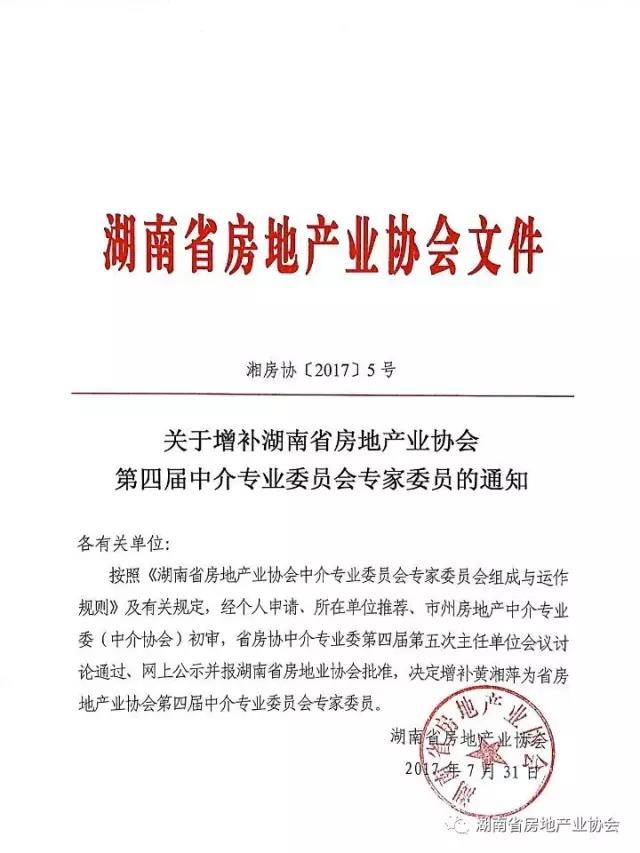 按照《湖南省房地產(chǎn)業(yè)協(xié)會中介專業(yè)委員會專家委員會組成與運(yùn)作規(guī)則》及有關(guān)規(guī)定,經(jīng)個人申請、所在單位推薦、市州房地產(chǎn)中介專業(yè)委(中介協(xié)會)初審,省房協(xié)中介專業(yè)委第四屆第五次主任單位會議討論通過、網(wǎng)上公示并報湖南省房地業(yè)協(xié)會批準(zhǔn),決定增補(bǔ)黃湘萍為省房地產(chǎn)業(yè)協(xié)會第四屆中介專業(yè)委員會專家委員。