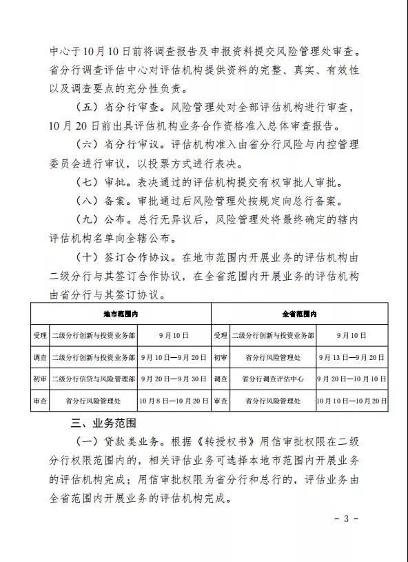 二級分行前臺業(yè)務部門負責對擬在地市范圍內開展業(yè)務的評估機構進行調查;省級分行前臺業(yè)務部門負責對擬在全省范圍內開展業(yè)務的評估機構進行調查,調查要點包括: