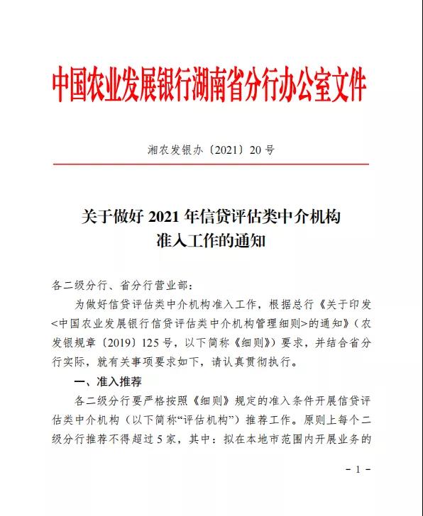 中國農業(yè)發(fā)展銀行湖南省分行關于做好2021年信貸評估類中介機構準入工作的通知