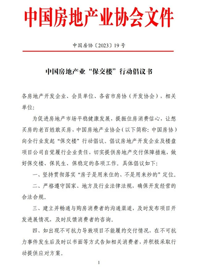 為促進(jìn)房地產(chǎn)市場平穩(wěn)健康發(fā)展,提振住房消費(fèi)信心,讓想買房的老百姓敢買房,中國房地產(chǎn)業(yè)協(xié)會向全行業(yè)發(fā)起“保交樓”行動倡議,全文如下:
