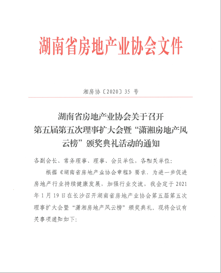 關于召開第五屆第五次理事擴大會暨“瀟湘房地產(chǎn)風云榜”頒獎典禮活動的通知