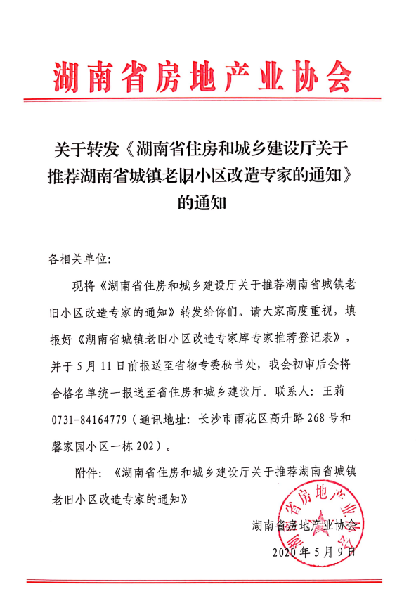 現(xiàn)將《湖南省住房和城鄉(xiāng)建設廳關于推薦湖南省城鎮(zhèn)老舊小區(qū)改造專家的通知》轉發(fā)給你們。請大家高度重視,填報好《湖南省城鎮(zhèn)老舊小區(qū)改造專家?guī)鞂<彝扑]登記表》,并于5月11日前報送至省物專委秘書處,我會初審后會將合格名單統(tǒng)一報送至省住房和城鄉(xiāng)建設廳。聯(lián)系人:王莉0731-84164779(通訊地址:長沙市雨花區(qū)高升路268號和馨家園小區(qū)一棟202)。