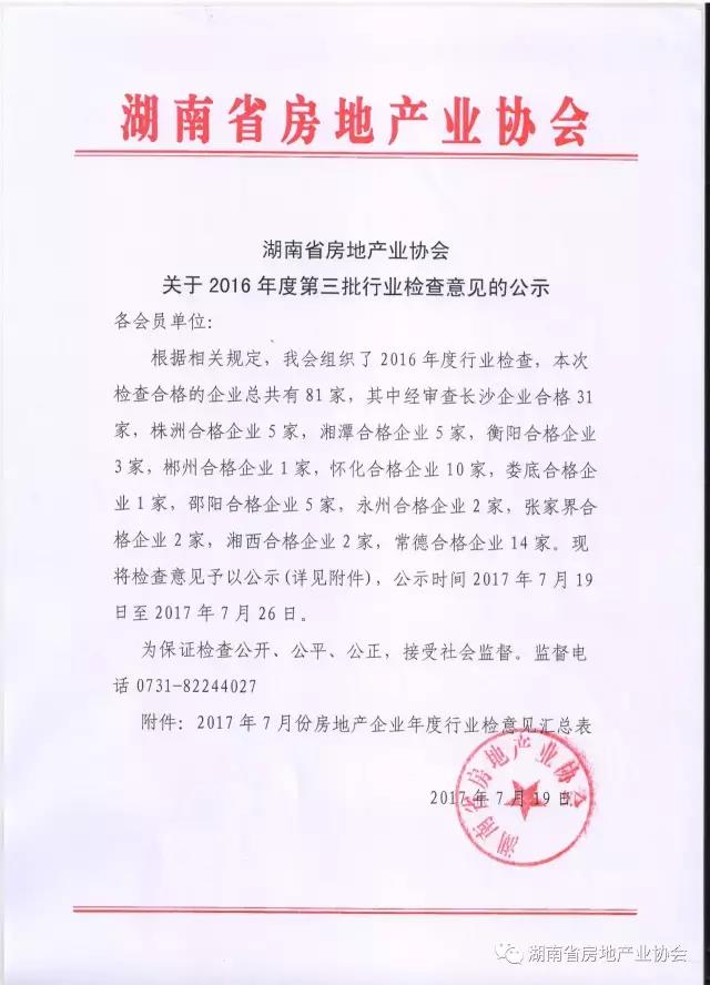 湖南省房地產(chǎn)業(yè)協(xié)會(huì)關(guān)于2016年度第三批行業(yè)檢查意見的公示