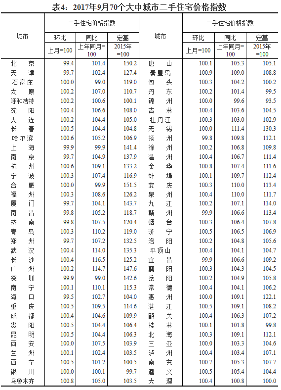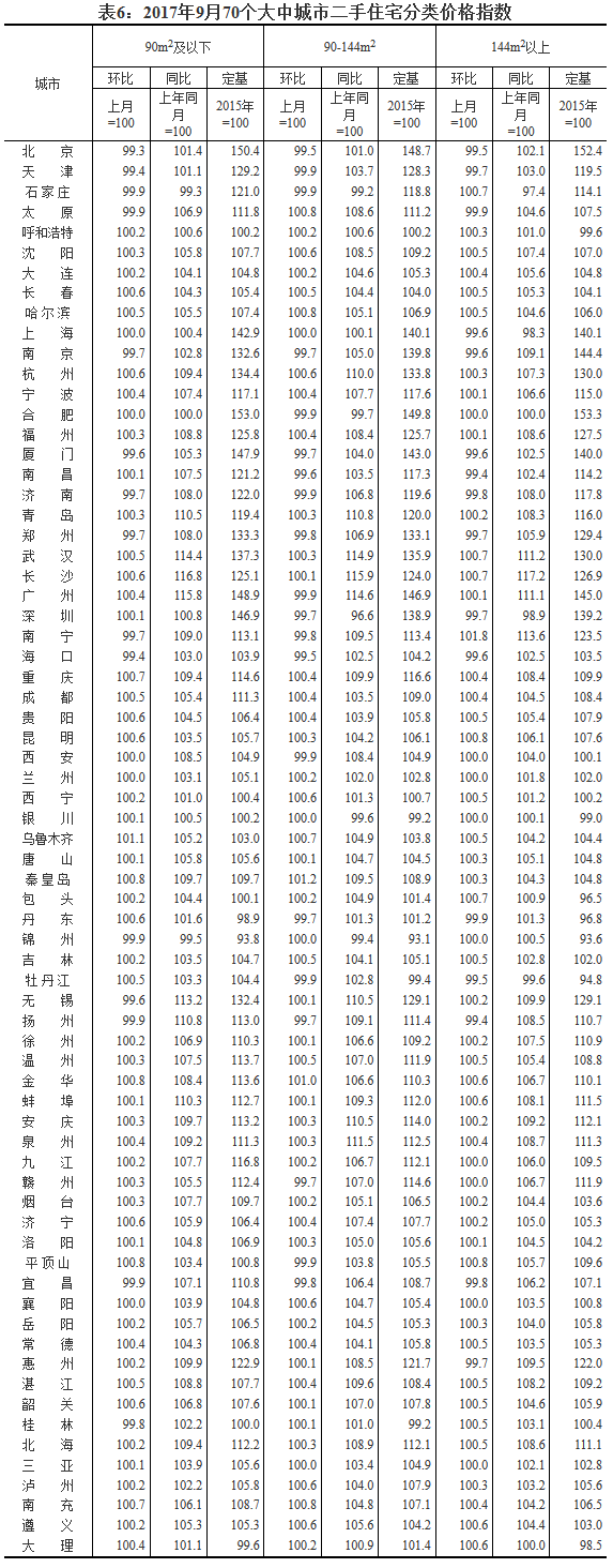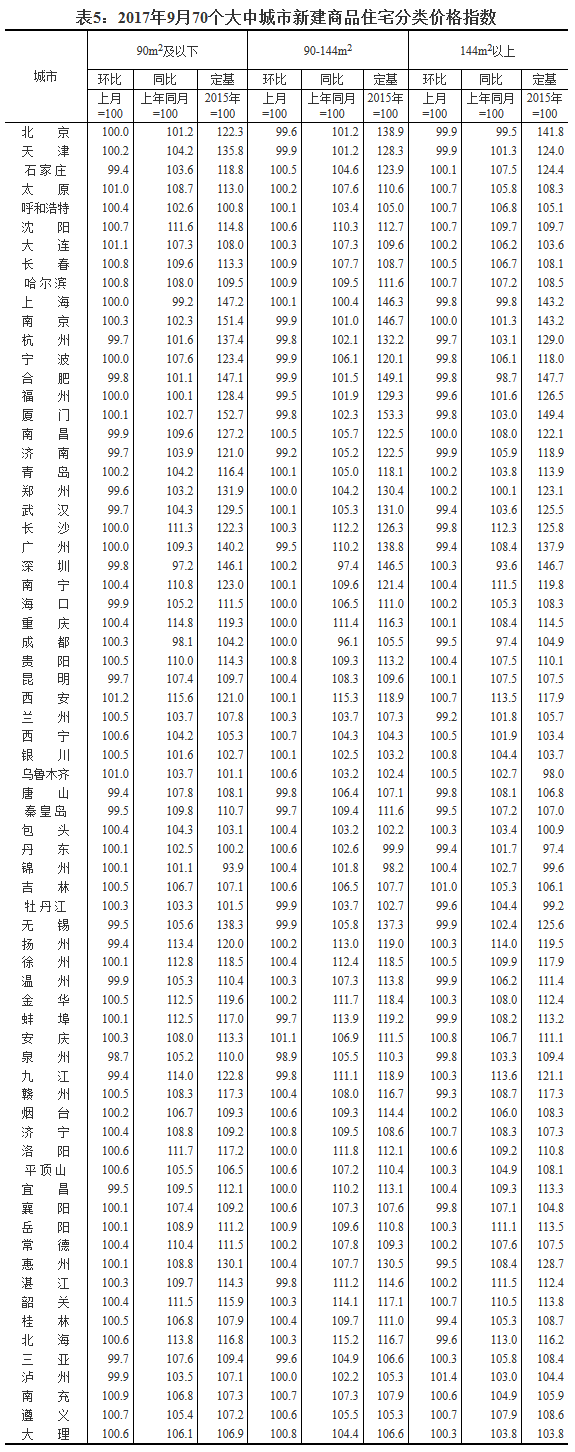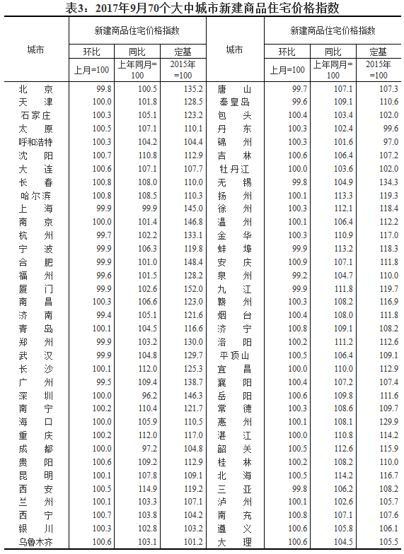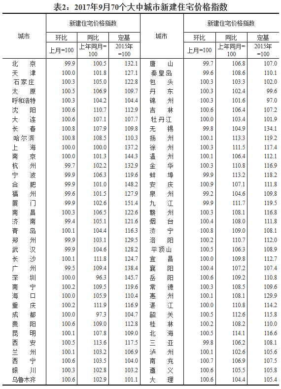 [國家統(tǒng)計(jì)局]2017年9月份70個(gè)大中城市住宅銷售價(jià)格變動(dòng)情況