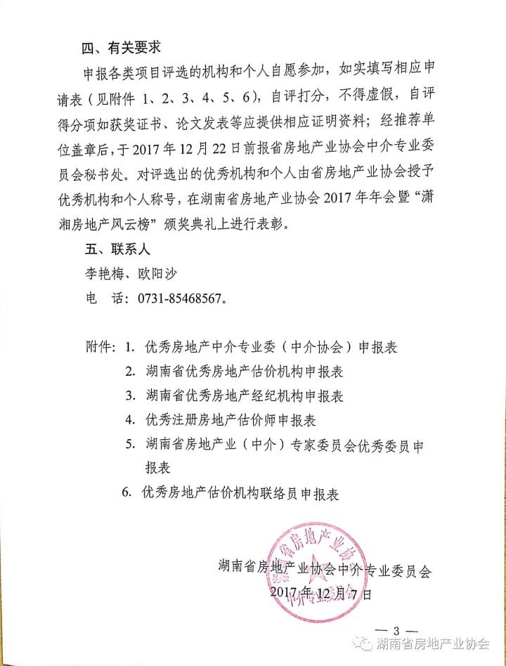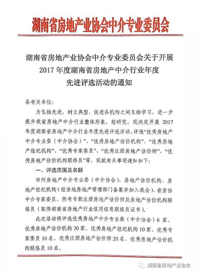 關于開展2017年度湖南省房地產(chǎn)中介行業(yè)年度先進評選活動的通知